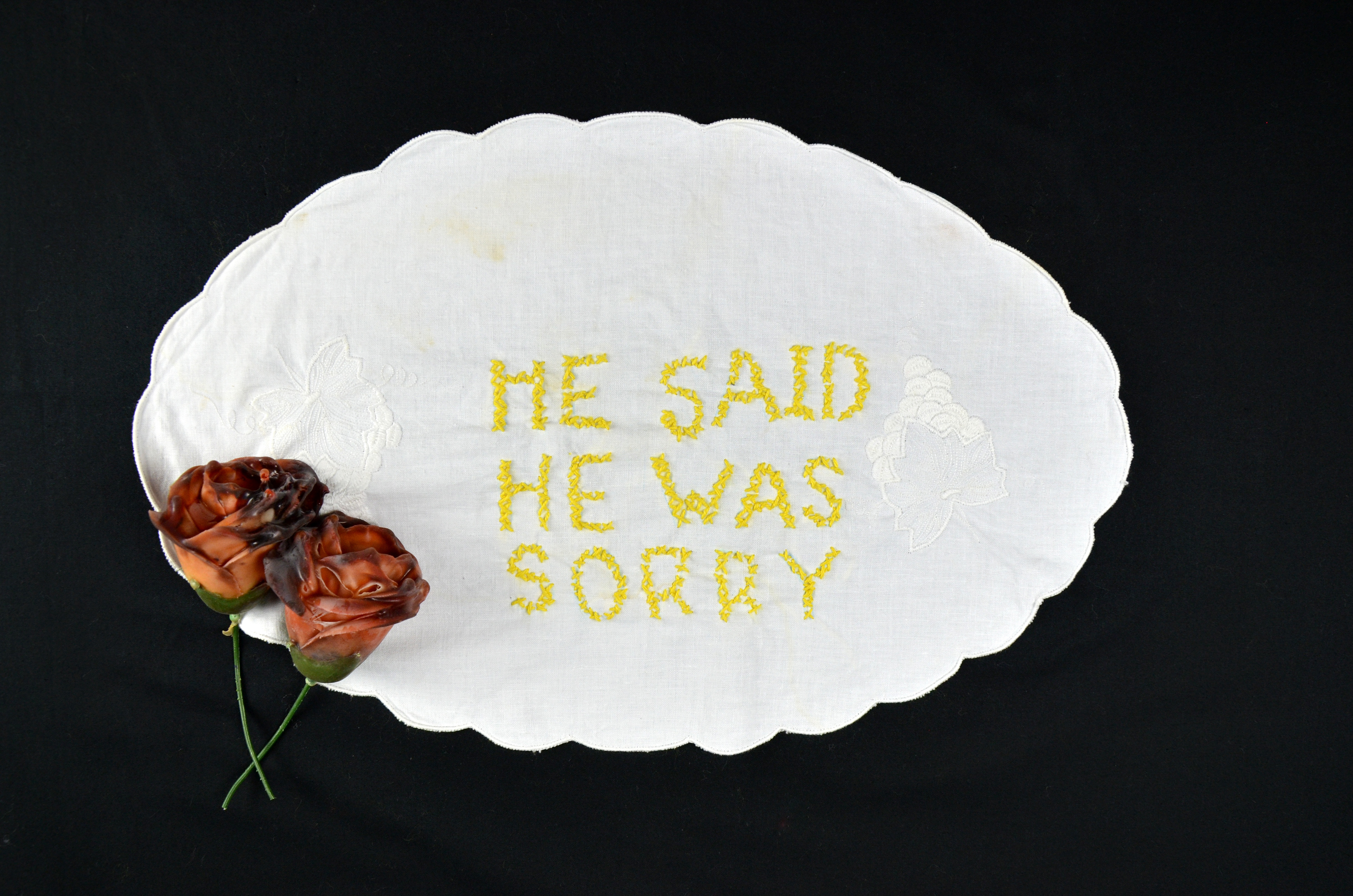 Dinner Time's subject matter looks at violence against women. It depicts a table set up for dinner, however, dinner was late, which causes a scenario of violence. The side tables show "bloody" food being prepared and "bruised" roses. The placemats are stitched with thoughts from the victim, blaming herself rather than her abuser.